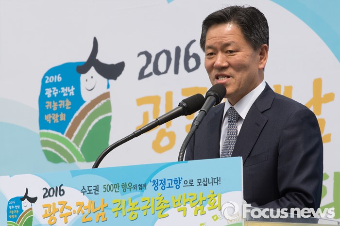 (서울=포커스뉴스) 22일 오전 서울 광화문 광장에서 열린 '2016 광주·전남 귀농귀촌 박람회'에서 주승용 국민의당 원내대표가 축사를 하고 있다.