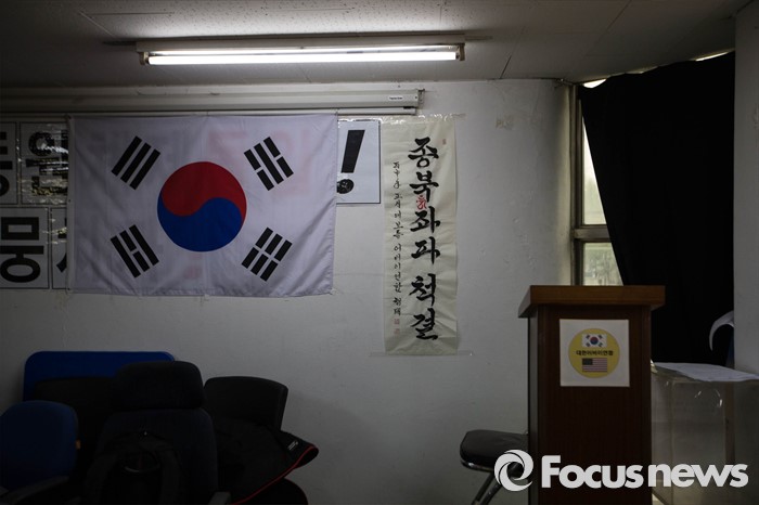 (서울=포커스뉴스) 22일 오전 서울 종로구에 위치한 어버이연합 사무실에 '종북좌파척결'이라 적힌 인쇄물이 붙어 있다. 전경련에서 자금지원을 받은 의혹으로 논란에 휩싸인 어버이연합은 이날 기자회견을 열고 언론에 보도된 어버이연합 관련 기사들에 반박했다.