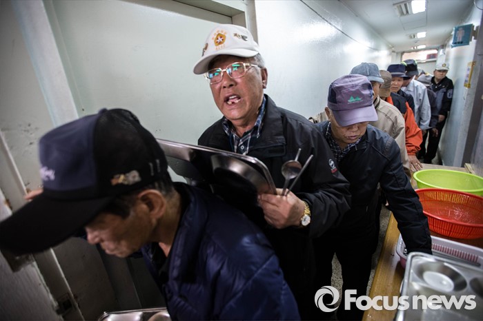 (서울=포커스뉴스) 22일 오전 서울 종로구에 위치한 어버이연합 사무실에서 전경련 자금지원 의혹에 휩싸인 어버이연합의 기자회견이 진행되고 있는 가운데 어버이연합 관계자들이 점심 배식을 받기 위해 줄을 서있다.