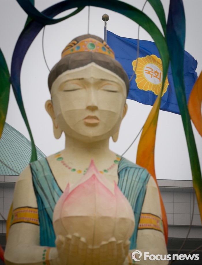 (서울=포커스뉴스) 석가탄신일을 3주 가량 앞둔 22일 오후 서울 여의도 국회 본청 앞 분수광장에 연등이 설치되어 있다.