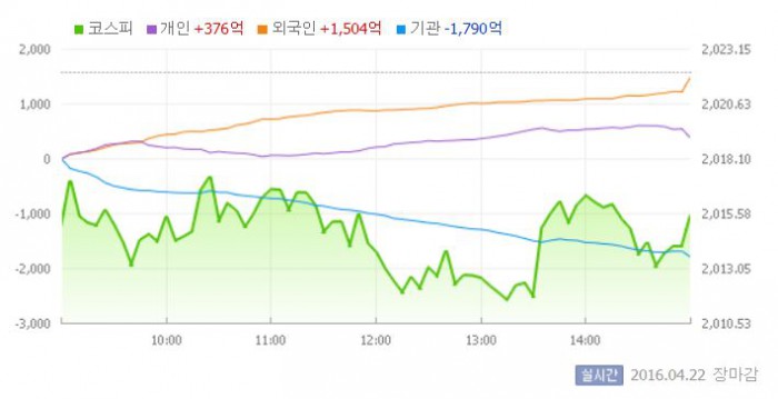 이날 코스피는 전일대비 0.35% 하락한 2014.93으로 장을 시작했다. 이후 지수는 2010선 부근에서 등락을 반복했다.
