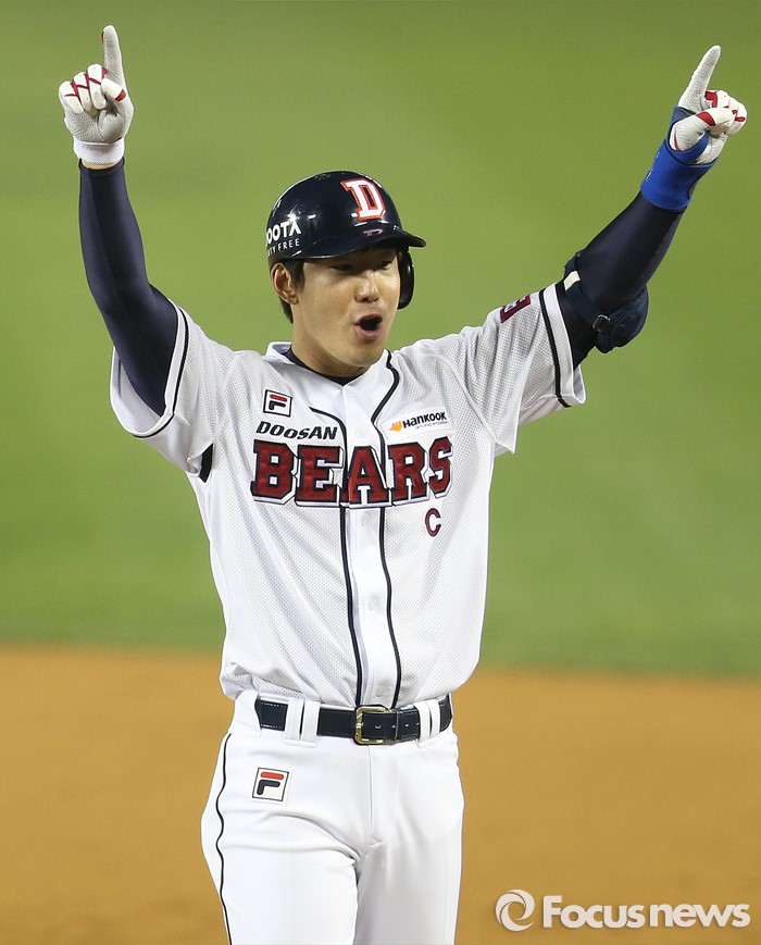 (서울=포커스뉴스) 22일 서울 잠실구장에서 열린 2016 프로야구 한화-두산 경기 5회말 1사 2,3루에서 두산 김재호가 주자를 모두 불러 들이는 좌전안타를 치고 1루에서 두 손을 번쩍 들고 환호하고 있다.