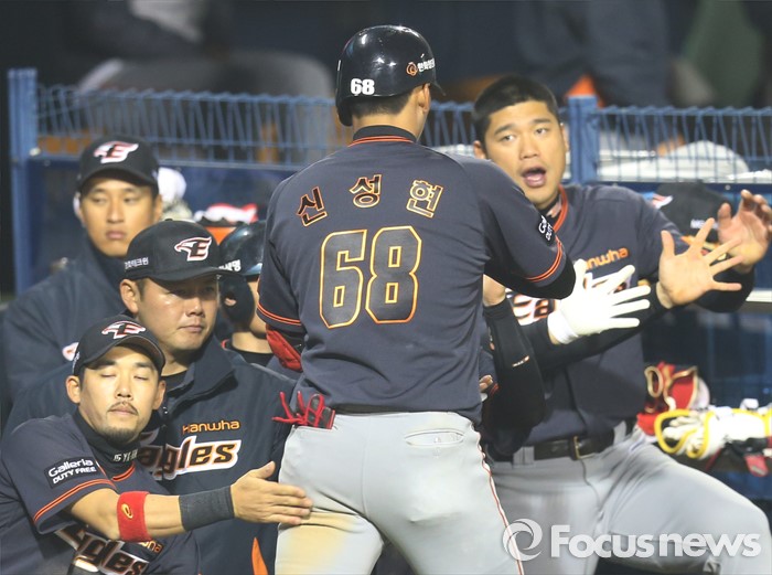 (서울=포커스뉴스) 22일 서울 잠실구장에서 열린 2016 프로야구 한화-두산 경기 9회초 한화 신성현이 좌월 솔로 홈런을 치고 덕아웃에서 동료들의 축하를 받고 있다.