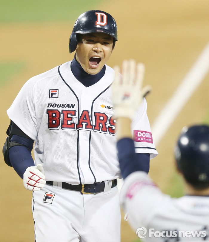(서울=포커스뉴스) 22일 서울 잠실구장에서 열린 2016 프로야구 한화-두산 경기 7회말 1사후 두산 에반스의 대타로 나온 김재환이 한화 투수 이재우의 초구에 우월 만루 홈런을 치고 환호하며 홈인하고 있다.