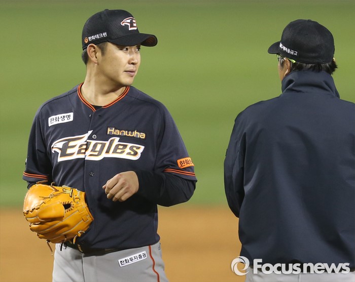 (서울=포커스뉴스) 22일 서울 잠실구장에서 열린 2016 프로야구 한화-두산 경기 6회말 2사 1,3루에서 한화 투수 송은범이 마운드를 내려가고 있다.