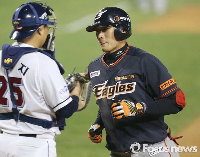(서울=포커스뉴스) 22일 서울 잠실구장에서 열린 2016 프로야구 한화-두산 경기 9회초 한화 신성현이 좌월 솔로 홈런을 치고 홈인하고 있다.