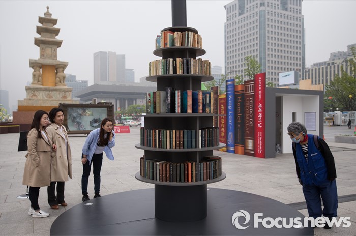 (서울=포커스뉴스) 세계 책의 날을 하루 앞둔 22일 오후 서울 광화문 북측광장에서 열린 '공공미술과 함께하는 월드북 데이' 행사에서 시민들이 탑 처럼 생긴 대형 책꽂이 모양의 예술품을 관람하고 있다.
