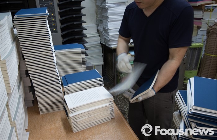 (서울=포커스뉴스) 세계 책의 날을 하루 앞둔 22일 오후 서울 중구 충무로의 한 인쇄소에서 책을 만들고 있다.