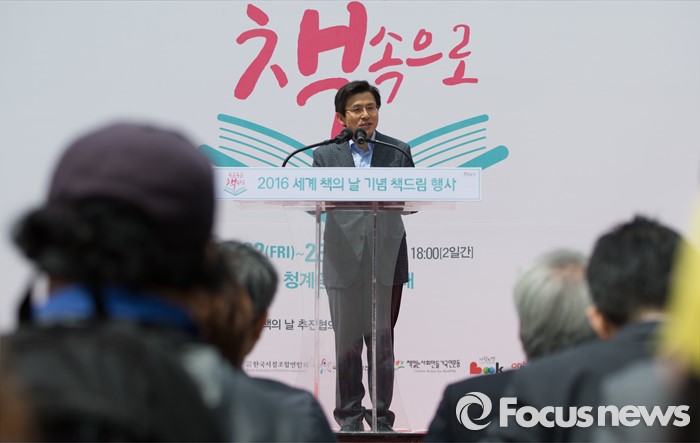(서울=포커스뉴스)유네스코가 1995년 제정한 ‘세계 책과 저작권의 날’인 23일 오전 서울 중구 청계광장에서 열린 2016 세계 책의 날 기념 책드림 행사 '두근두근 책 속으로'에서 황교안 국무총리가 축사를 하고 있다.