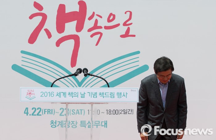 (서울=포커스뉴스)유네스코가 1995년 제정한 ‘세계 책과 저작권의 날’인 23일 오전 서울 중구 청계광장에서 열린 2016 세계 책의 날 기념 책드림 행사 '두근두근 책 속으로'에서 황교안 국무총리가 인사를 하고 있다.