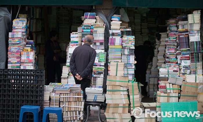 (서울=포커스뉴스) 세계 책의 날인 23일 오전 서울 중구 청계6가 평화시장 헌책방 골목에서 한 노인이 책방에 쌓인 책을 바라보고 있다. 청계 6가 헌책방거리는 1970년대 점포수가 200여 개에 달할 정도로 성황이었지만 현재는 25곳 정도 밖에 남아 있지 않다.