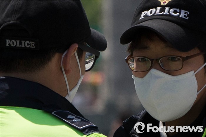 (서울=포커스뉴스) 서울지역에 33시간 지속됐던 미세먼지주의보가 해제된 24일 오전 서울 광화문 일대에 경찰들이 마스크를 쓰고 근무하고 있다.