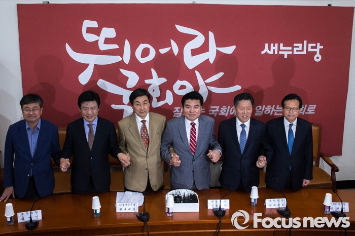 (서울=포커스뉴스) (왼쪽 세번째부터) 더민주 이종걸, 새누리당 원유철, 국민의당 주승용 원내대표가 24일 오후 서울 여의도 국회에서 열린 3당 원내대표 회담에 참석, 취재진을 향해 포즈를 취하고 있다.