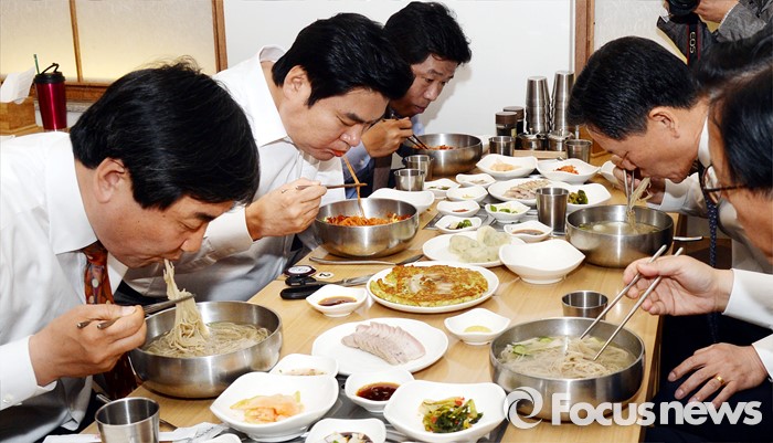 (서울=포커스뉴스) 24일 서울 여의도 한 식당에서 여,야 3당 원내대표가 화합하여 모든 정책을 잘 버무려 내겠다는 비빔냉면과 국민들에게 시원한 정치를 보여주겠다는 뜻의 물냉면을 먹는 오찬 냉면 회동을 갖고 있다.