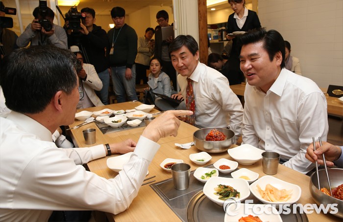 (서울=포커스뉴스) 24일 서울 여의도 한 식당에서 여,야 3당 원내대표가 화합하여 모든 정책을 잘 버무려 내겠다는 비빔냉면과 국민들에게 시원한 정치를 보여주겠다는 뜻의 물냉면을 먹는 오찬 냉면 회동을 갖고 있다.