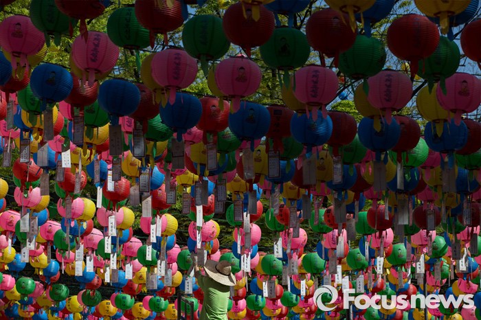 (서울=포커스뉴스) 24일 오후 서울 성북구 길상사에 부처님오신날을 앞두고 관계자가 연등을 설치하고 있다.