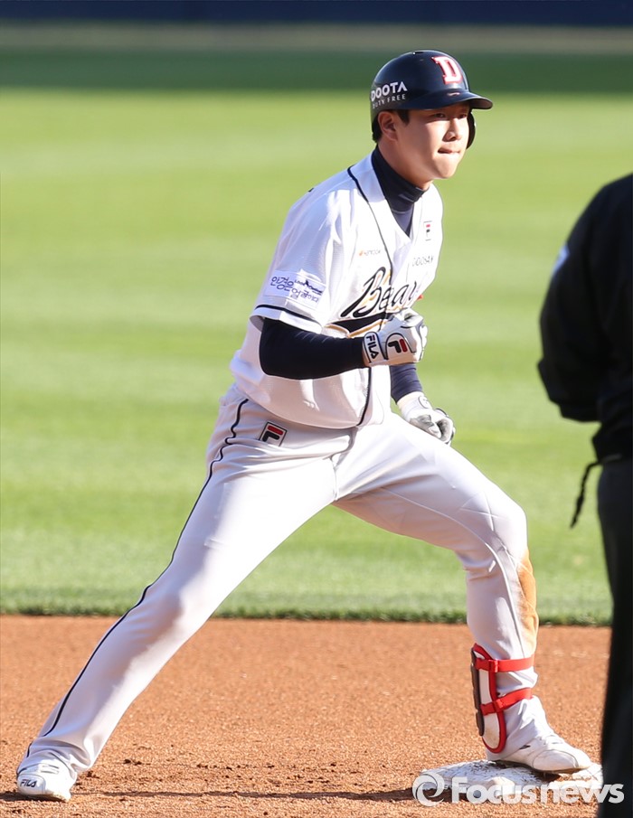(서울=포커스뉴스) 24일 서울 잠실구장에서 열린 2016 프로야구 한화-두산 경기 1회말 2사 1,3루에서 두산 박건우가 우중간 2루타를 치고 2루에서 주먹을 불끈 쥐며 기뻐하고 있다.