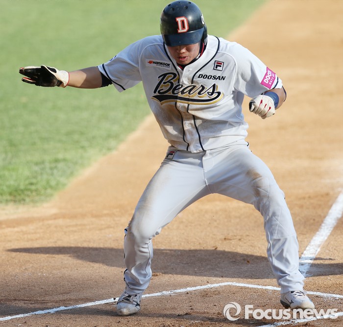 (서울=포커스뉴스) 24일 서울 잠실구장에서 열린 2016 프로야구 한화-두산 경기 1회말 무사 만루에서 두산 오재일의 1루수앞 땅볼때 3루주자 허경민이 1루수 김태균의 악송구로 홈에서 세이프되고 있다.