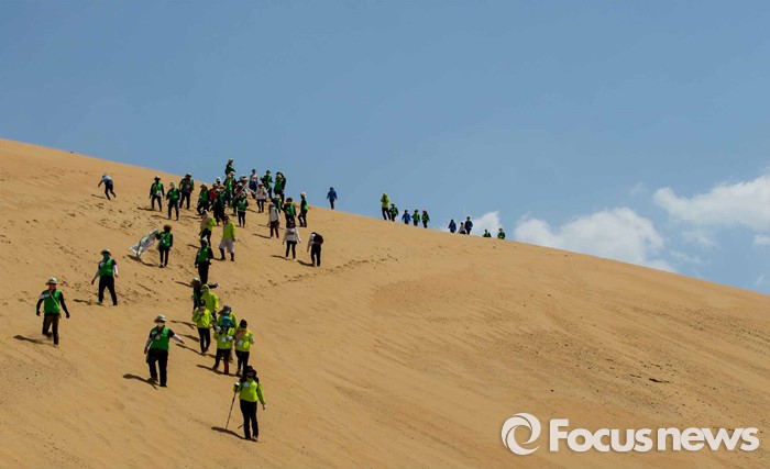 (다라더치/중국=포커스뉴스) 24일 오전 중국 내몽고 다라더치 쿠부치사막에서 한ㆍ중ㆍ일 대학생들로 구성된 2016 미래숲 15기 녹색봉사단원들이 사막트래킹을 하고 있다. 미래숲 녹색봉사단은 이번 봉사활동을 통해 황폐화된 사막에 나무 심기 및 각국 청년들과 우호를 증진을 위한 교류 활동을 전개할 예정이다.