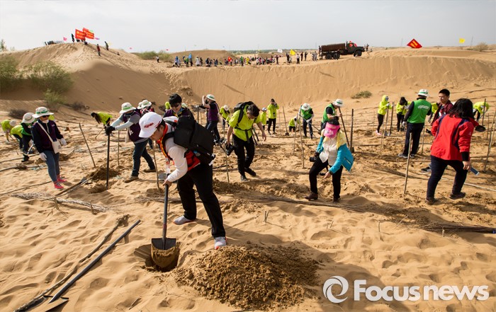 (다라더치/중국=포커스뉴스) 24일 오후 중국 내몽고 다라더치 쿠부치사막에서 2016 미래숲 15기 녹색봉사단 후원사 회원들이 나무심기작업을 하고 있다. 미래숲 녹색봉사단은 이번 봉사활동을 통해 황폐화된 사막에 나무 심기 및 각국 청년들과 우호를 증진을 위한 교류 활동을 전개할 예정이다.