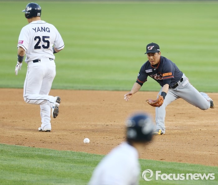 (서울=포커스뉴스) 24일 서울 잠실구장에서 열린 2016 프로야구 한화-두산 경기 5회말 1사 1,2루에서 한화 2루수 정근우가 두산 오재원의 투수 맞고 굴절된 타구를 잡고 있다.