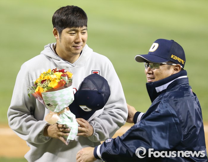 (서울=포커스뉴스) 24일 서울 잠실구장에서 열린 2016 프로야구 한화-두산 경기에서 두산 장원준이 승리 투수가 되며 통산 100승을 기록했다. 김태형 감독이 꽃다발을 전해 주며 축하하고 있다.