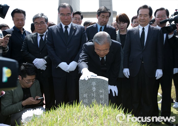 | △ 열사 묘비 만지는 김종인 |