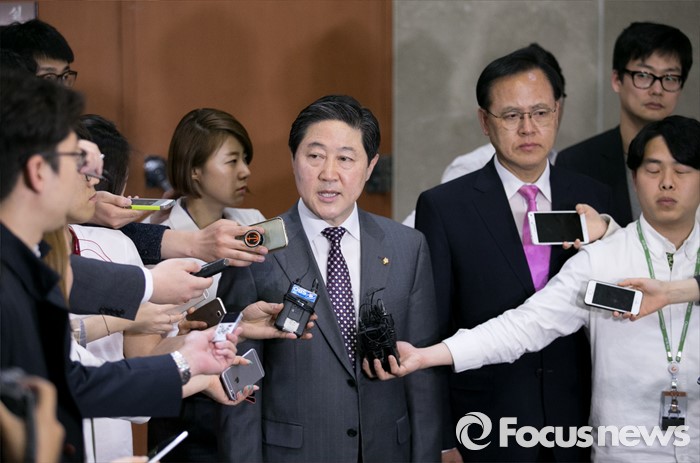 (서울=포커스뉴스) 유기준(왼쪽) 새누리당 의원이 28일 오후 서울 여의도 국회 정론관에서 정책위의장 러닝메이트 후보인 이명수 의원과 원내대표 출마 기자회견을 마친 뒤 취재진 질문에 답하고 있다.