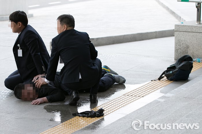 (서울=포커스뉴스) 25일 오후 서울 여의도 국회 의원회관 앞에서 신원 미상의 한 중년 남성이 분신 시도를 하려다, 국회 방호원들에게 제압당하고 있다.