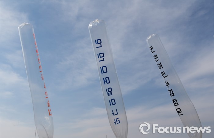 (파주=포커스뉴스) 29일 오후 경기 파주 낙하IC 인근에서 탈북자단체인 자유북한운동연합이 북한에 핵과 미사일을 포기하고 국제사회 일원으로 참여할 것을 촉구하는 내용의 대북전단을 날려보내고 있다.
