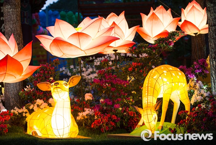 (서울=포커스뉴스) 부처님오신날을 앞두고 26일 밤 서울 종로구 견지동 조계사 정문 앞에다양한 형태의 연등들이 불을 밝히고 있다.