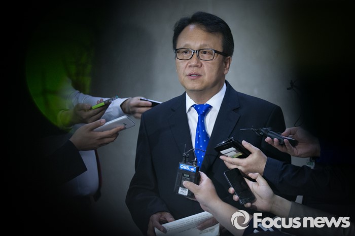 (서울=포커스뉴스) 민병두 더불어민주당 의원이 29일 오후 서울 여의도 국회 정론관에서 원내대표 출마 기자회견을 마친 뒤 취재진 질문에 답하고 있다.