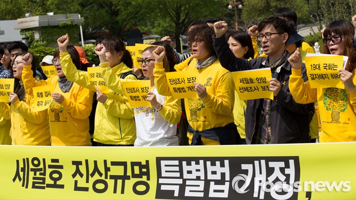 (서울=포커스뉴스) 25일 오전 서울 여의도 국회의사당 정문 앞에서 4월 16일의 약속국민연대 관계자들이 세월호 진상규명 특별법 개정 및 특검 실시 촉구 기자회견을 하고 있다.