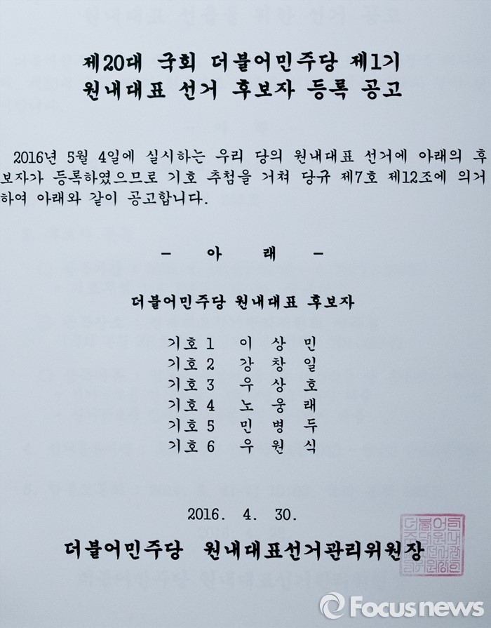 (서울=포커스뉴스) 더불어민주당의 20대 국회 첫 원내대표 선출을 이틀 앞둔 2일 오후 서울 여의도 국회 더불어민주당 원내대표실 앞에 원내대표 선거 후보자 등록 공고문이 게시되어 있다.