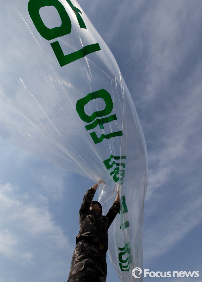 (파주=포커스뉴스) 29일 오후 경기 파주 낙하IC 인근에서 탈북자단체인 자유북한운동연합이 북한에 핵과 미사일을 포기하고 국제사회 일원으로 참여할 것을 촉구하는 내용의 대북전단을 날려보내기 위해 수소가스를 주입하고 있다.