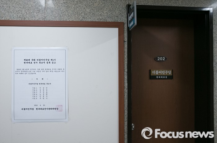 (서울=포커스뉴스) 더불어민주당의 20대 국회 첫 원내대표 선출을 이틀 앞둔 2일 오후 서울 여의도 국회 더불어민주당 원내대표실 앞에 원내대표 선거 후보자 등록 공고문이 게시되어 있다.