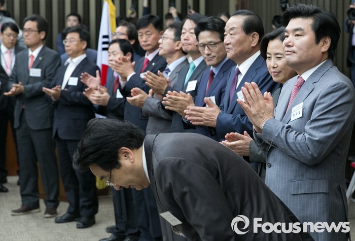 새누리당은 오는 29일 선거일을 공고한 뒤 다음달 3일 차기 원내대표를 선출할 예정이다. 차기 원내대표로는 친박계 홍문종·유기준 의원이, 비박계 나경원·정진석 의원이 거론되고 있다.26일 오전 서울 여의도 국회에서 열린 새누리당 20대 총선 당선자 워크숍에 참석한 원유철 원내대표 등 경기도 지역 당선인들이 인사하고 있다. 2016.04.26 박동욱 기자