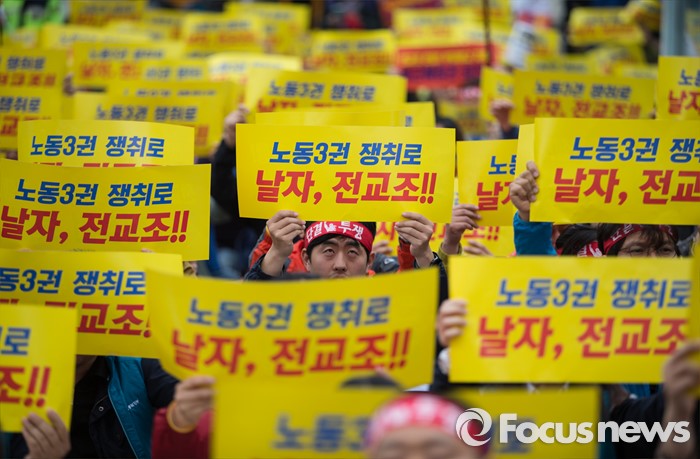 (서울=포커스뉴스) 27일 오후 서울 종로구 정부종합청사 앞에서 전교조(전국교직원노동조합)와 민주교육과 전교조 지키기 전국행동의 주최로 법외노조 후속조치 규탄 및 부당해고 저지, 노동기본권 쟁취를 위한 집회가 열리고 있다.