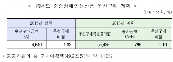 2015년도 공공기관의 중증장애인생산품 우선구매실적은 4640억원으로 2014년(3530억원)보다 31.4% 증가해 우선구매비율 1.02%를 달성했다.