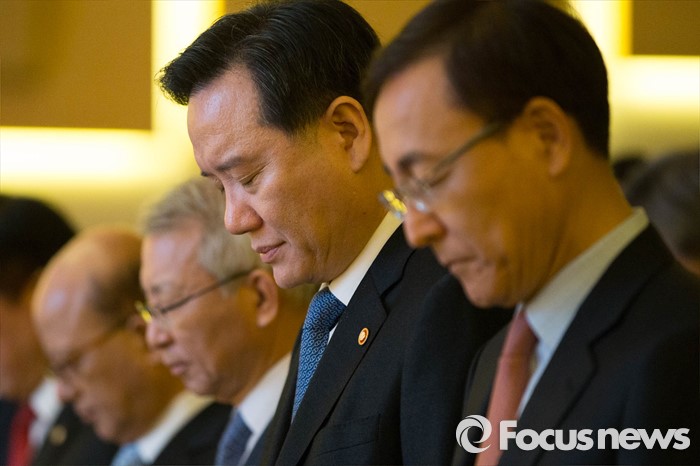 (서울=포커스뉴스) 25일 오전 서울 서초구 대검찰청에서 열린 제53회 법의날 기념식에서 참석자들이 국민의례를 하고 있다. 왼쪽부터 박한철 헌법재판소장, 양승태 대법원장, 김현웅 법무부장관, 김수남 검찰총장.