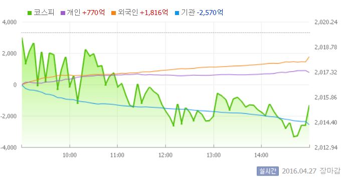 이날 코스피는 전일 대비 0.02% 내린 2019.31에 장을 시작했다. 이후 지수는 상승과 하락을 반복하다 기관의 매도에 다시 약세로 돌아섰다. 장 중반 기관의 매도 공세가 거세지면서 지수는 2013선까지 하락하기도 했다.