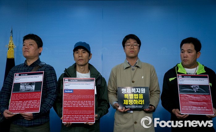 (서울=포커스뉴스) 진선미 더불어민주당 의원과 형제복지원 사건 피해생존자, 실종자, 유가족모임 등이 27일 오전 서울 여의도 국회 정론관에서 형제복지원 특별법 제정 촉구 기자회견을 하고 있다.