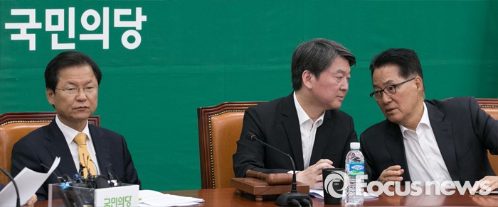 (서울=포커스뉴스) 2일 오전 서울 여의도 국회에서 열린 국민의당 최고위원회의에 참석한 안철수(가운데) 상임공동대표와 박지원(오른쪽) 원내대표가 대화하고 있다. 왼쪽은 천정배 공동대표.