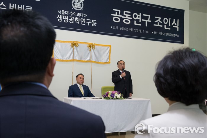 (서울=포커스뉴스) 25일 오전 서울 관악구 서울대학교 수의과대학 생명공학 연구동에서 열린 서울대-BBQ 공동연구 조인식에 박용호 서울대 수의과대학 교수가 인사말을 하고 있다.