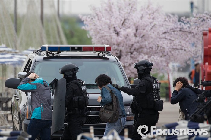 (서울=포커스뉴스) 27일 오전 서울 영등포구 여의도 한강공원 원효대교 일대에서 열린 '수도 서울 민․관․군 합동 대규모 복합재난 가상훈련'에 참가한 경찰특공대가 훈련에 임하고 있다.