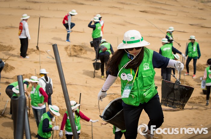 (다라더치/중국=포커스뉴스) 25일 오후 중국 내몽고 다라더치 쿠부치사막에서 2016 미래숲 15기 녹색봉사단원들이 나무 심기 작업을 하고 있다. 미래숲 녹색봉사단은 이번 봉사활동을 통해 황폐화된 사막에 나무 심기 및 각국 청년들과 우호를 증진을 위한 교류 활동을 전개했다.