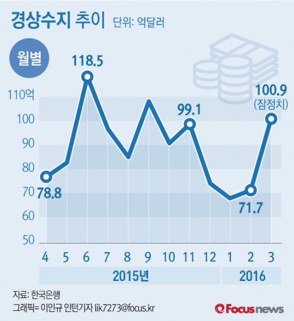 2일 한국은행이 낸 '2016년 3월 국제수지(잠정)'를 보면 지난 3월 경상수지는 전월 대비 29억2000만 달러 늘어난 100억9000만달러를 기록했다. 이는 지난 2012년 3월 이후 49개월 동안 계속된 역대 최장 흑자 기록이다.