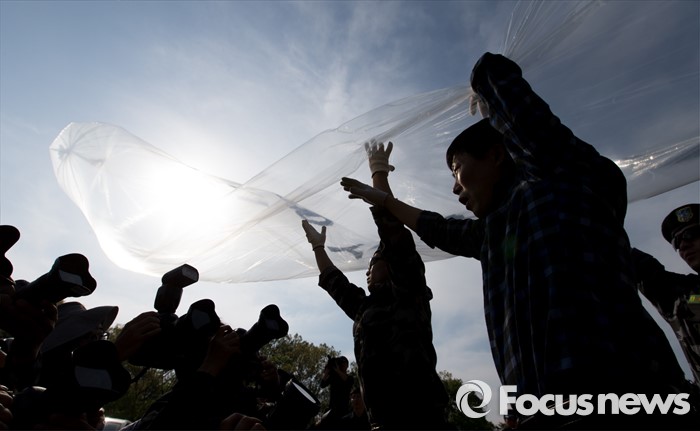 (파주=포커스뉴스) 29일 오후 경기 파주 낙하IC 인근에서 탈북자단체인 자유북한운동연합이 북한에 핵과 미사일을 포기하고 국제사회 일원으로 참여할 것을 촉구하는 내용의 대북전단을 날려보내기 위해 수소가스를 주입하고 있다.