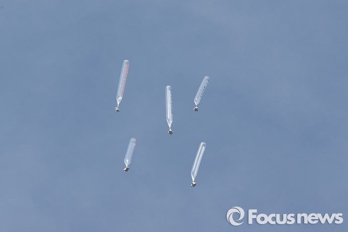 (파주=포커스뉴스) 29일 오후 경기 파주 낙하IC 인근에서 탈북자단체인 자유북한운동연합이 북한에 핵과 미사일을 포기하고 국제사회 일원으로 참여할 것을 촉구하는 내용의 대북전단을 날려보내고 있다.