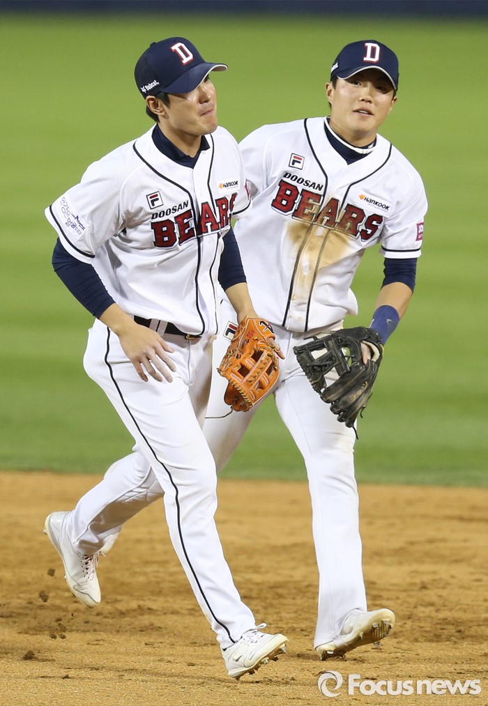 (서울=포커스뉴스) 26일 서울 잠실구장에서 열린 2016 프로야구 SK-두산 경기 8회초 1사후 병살플레이를 성공하면서 수비를 마친 두산 유격수 김재호(왼쪽)와 2루수 류지혁이 덕아웃으로 뛰어가고 있다.